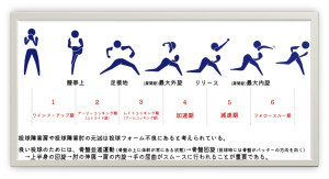 野球の投球動作は、ワインドアップ期、アーリーコッキング期、レイトコッキンング期、アクセラレーション期(加速期・減速期)、フォロースルー期の5・6相に大別され、それぞれの期において受傷原因があります。