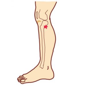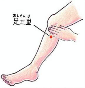 ❷,「 足三里 」:膝のお皿の下端の外側から下に指4本分の所