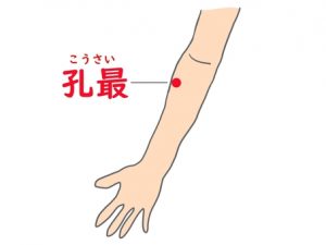❷「 孔最 」:肘を曲げた時のシワから手関節のシワの間を半分にしてそこから親指1