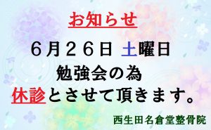 6月26日土曜日は、勉強会の為休診とさせて頂きます。