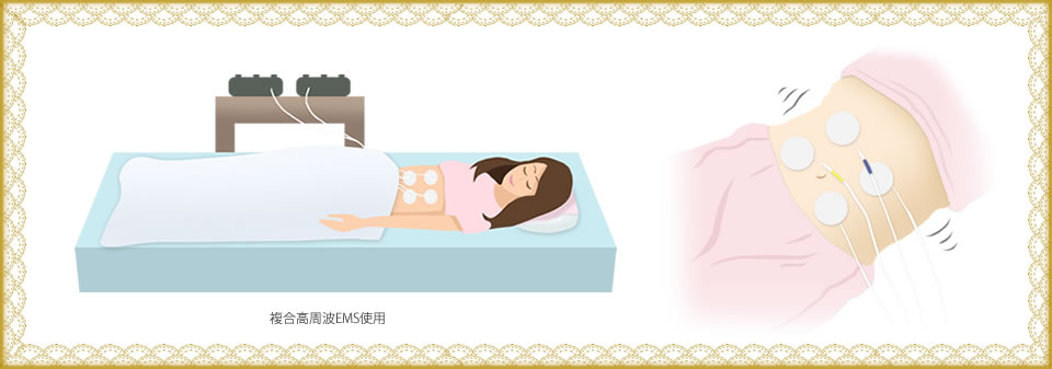 専用ベッドに仰向けに寝ていただき、お腹や背中にスタッフが大きめのパッドを取り付けます。(女性には女性スタッフが取り付けます)そのまま30分間寝ているだけでOKです。