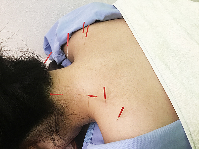 鍼灸(はりきゅう)の東洋医学では、ぜんそくの症状だけにとらわれず体全体を整えるようにアプローチをします。刺鍼する場所としては、仰向けで足からおへそ周り、腕から頭のてっぺん。うつぶせではふくらはぎから背中全体、そして後頭部までほぼ全身にわたり刺鍼します。
